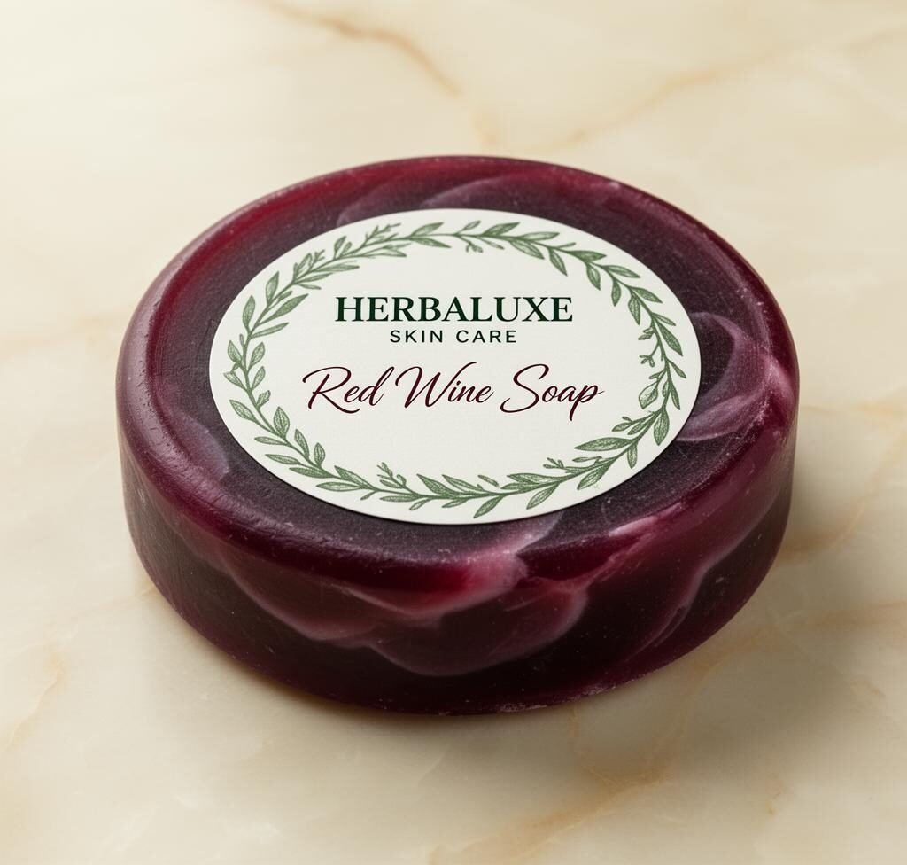 Herbaluxe Red Wine Soap is enriched with red wine extract and vitamin E to support skin brightness and a healthy glow.